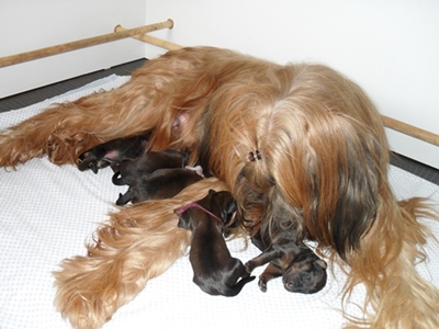 Leider wurden eine weitere Hündin und ein Rüde tot geboren. Manchmal ist das Leben grausam, zu Ende ehe es angefangen hat. Aber jetzt freuen wir uns über eine richtig hübsche kleine Familie mit freier Auswahl an der Milchbar.