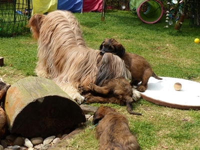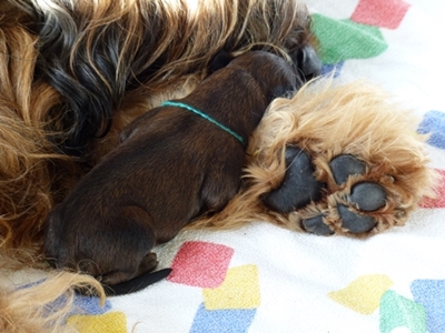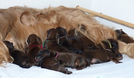 Edda hat ihre "große Liebe" diesmal in den Niederlanden gefunden!!! Die Wahl fiel auf den sehr lieben und souveränen 4 jährigen fauven "Sam", der in Soest lebt. Im November haben die zwei sich schonkennengelernt, aber das eigentliche Rendezvous fand am 11./12.01. statt.Am 13./14.03. wurden die Babys geboren, sage und schreibe 11!!! Ein kleiner Rüde ist leider mit 3 Wochen noch verstorben, sehr sehr traurig.....