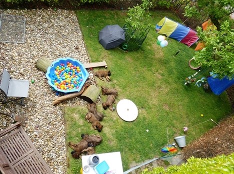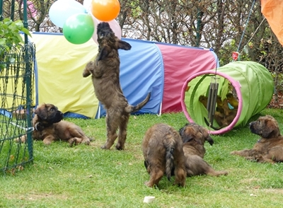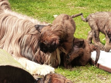 08.05.17 Bald 8 Wochen alt. In den nächsten Tagen ziehen die Ersten aus, dann wird es wieder still hier...... Aber bis dahin halten sie hier alles mächtig auf Trab. Mutti Edda scheint die Erziehungspflicht an Brielle abgegeben zu haben und die hat mächtig Spaß an ihrer Aufgabe! Prima, kann sie schon für ihre demnächst eigenen Hundekinder üben ;-) |